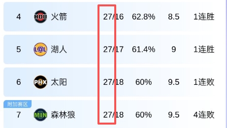 值得一提的是,西部第4火箭、第5湖人、第6太阳和第7森林狼胜场数都是27场。